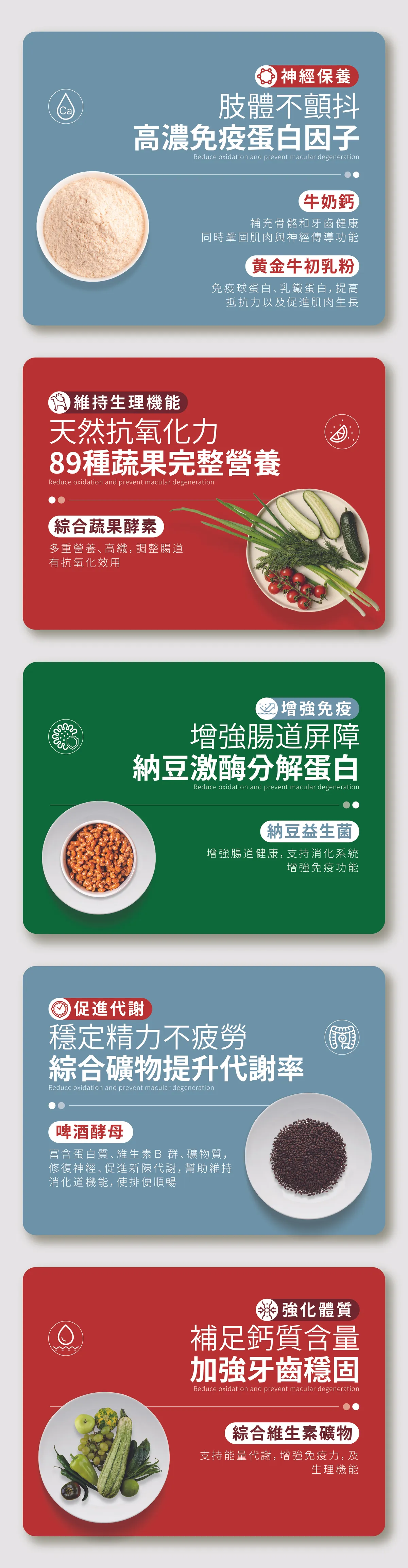 成份:初乳粉、維生素B群、綜合維生素礦物質、納豆益生菌、全脂奶粉、玉米來源可溶性纖維、啤酒酵母粉、牛奶鈣、綜合蔬果酵素(綜合蔬果粉-A(麥芽糊精、蘋果濃縮汁、梨子濃縮汁、奇異果濃縮汁、辛烯基丁二酸鈉澱粉、胡瓜汁、芹菜汁、菠菜汁、白菜汁、鳳梨濃縮汁、檸檬濃縮汁、百香果汁、黃槴子色素、槴子藍色素)、麥芽糊精、綜合果汁粉(砂糖、麥芽糊精、綜合水果濃縮汁(百香果、鳳梨、橘子、香蕉、蜜柑、芒果、木瓜、萊姆、 檸檬、蘋果、白葡萄、水蜜桃、藍莓、西印度櫻桃、紅葡萄)、檸檬酸、檸檬酸鈉、香料、蘋果酸、β-胡蘿蔔素)、綜合蔬果粉-B(砂糖、麥芽糊精、蘋果濃縮汁、鳳梨濃縮汁、紅蘿蔔濃縮汁、橘子濃縮汁、番茄泥、氧化澱粉(樹薯)、檸檬酸、香料、檸檬酸鈉、β-胡蘿蔔素、婀娜多色素)、巴糖醇(甜味劑)、二氧化矽、綜合蔬果酵素粉(白蘿蔔、胡蘿蔔、山藥、山芹菜、蕹菜、青花菜、芹菜、芥菜、結球萵苣、劍葉萵苣、高麗菜、半結球萵苣、球莖甘藍、茄子、青椒、小黃瓜、花胡瓜、 南瓜、山苦瓜、茼蒿、結球白菜、油菜、蚵白菜、長豇豆、扁蒲、紅鳳菜、玉米筍、青辣椒、紫地瓜葉、綠地瓜葉、菠菜、野莧菜、牛蕃茄、秋葵、紅甘薯、冬瓜、大心菜、甜菜根、紫高麗菜、生薑、甜瓜、西瓜、青木瓜、新疆哈密瓜、洋香瓜、蕃茄、鳳梨、葡萄柚、柳橙、柑橘、茂谷柑、番石榴、葡萄、香蕉、波蘿蜜、火龍果、日本蜜柑、青梅、白葡萄、桑椹、蜜棗、檸檬、蜜梨、杏鮑菇、金針菇、鮑魚菇、香菇、黑木耳、胡蘿蔔葉、五葉松、咸豐草、石蓮花、仙人掌果、 花生莖、淡竹葉、東印度羅勒、辣木葉、破布子、枸杞、薄荷葉、香蘭、魚腥草、 迷迭香、芫菜、芭樂葉、乳糖、玉米澱粉)