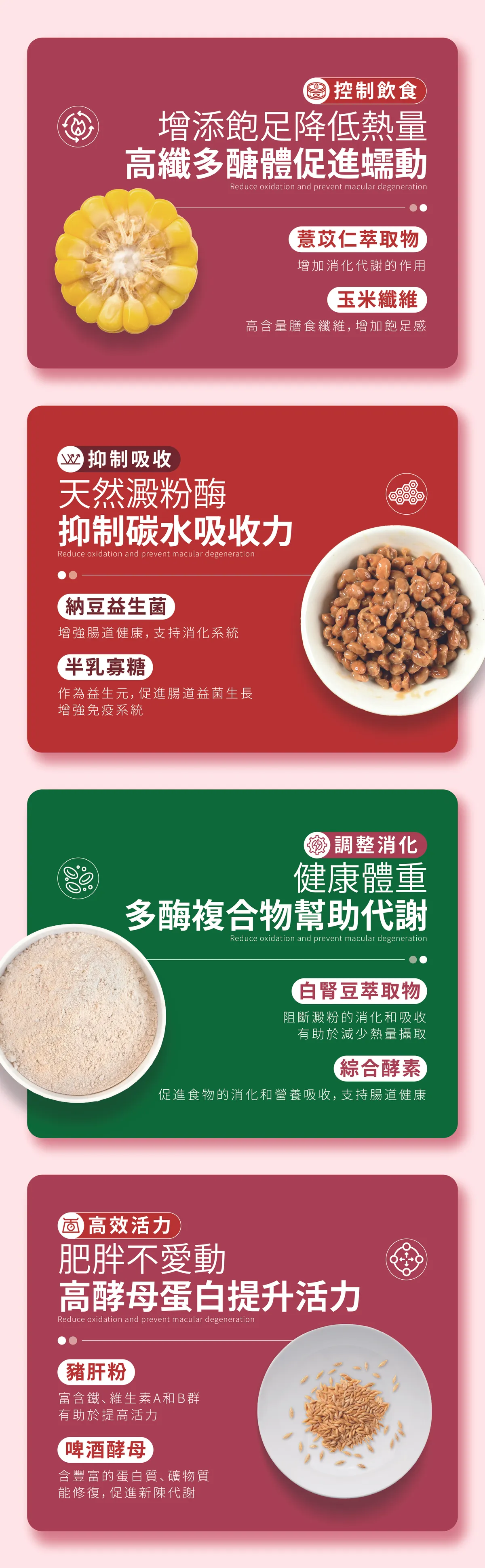 成份:白腎豆萃取物、薏苡仁萃取物、半乳寡糖、納豆益生菌、玉米來源可溶性纖維、啤酒酵母粉、綜合酵素(含澱粉酶、乳糖酶、蛋白酶、纖維素酶、脂肪酶)